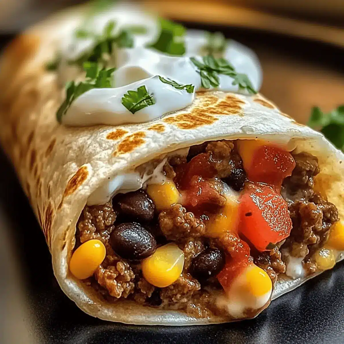 - Lay a warmed tortilla flat, add a scoop of the beef mixture, cheesy rice mixture, a dollop of sour cream, and sprinkle with cilantro.