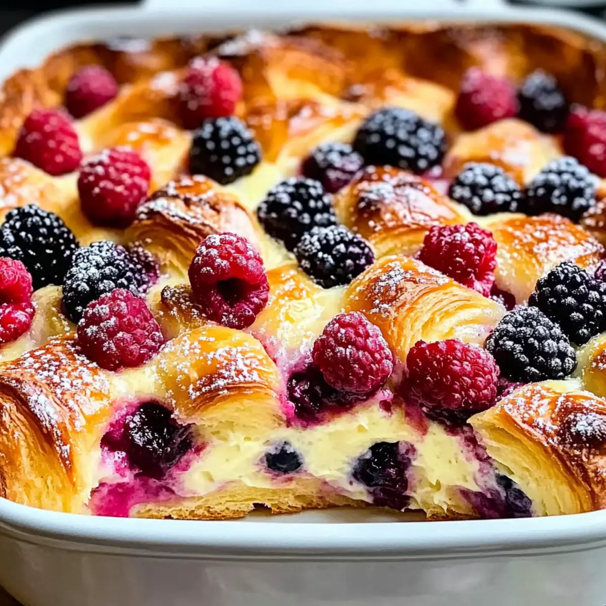 - Sprinkle the mixed berries evenly over the croissant layers.