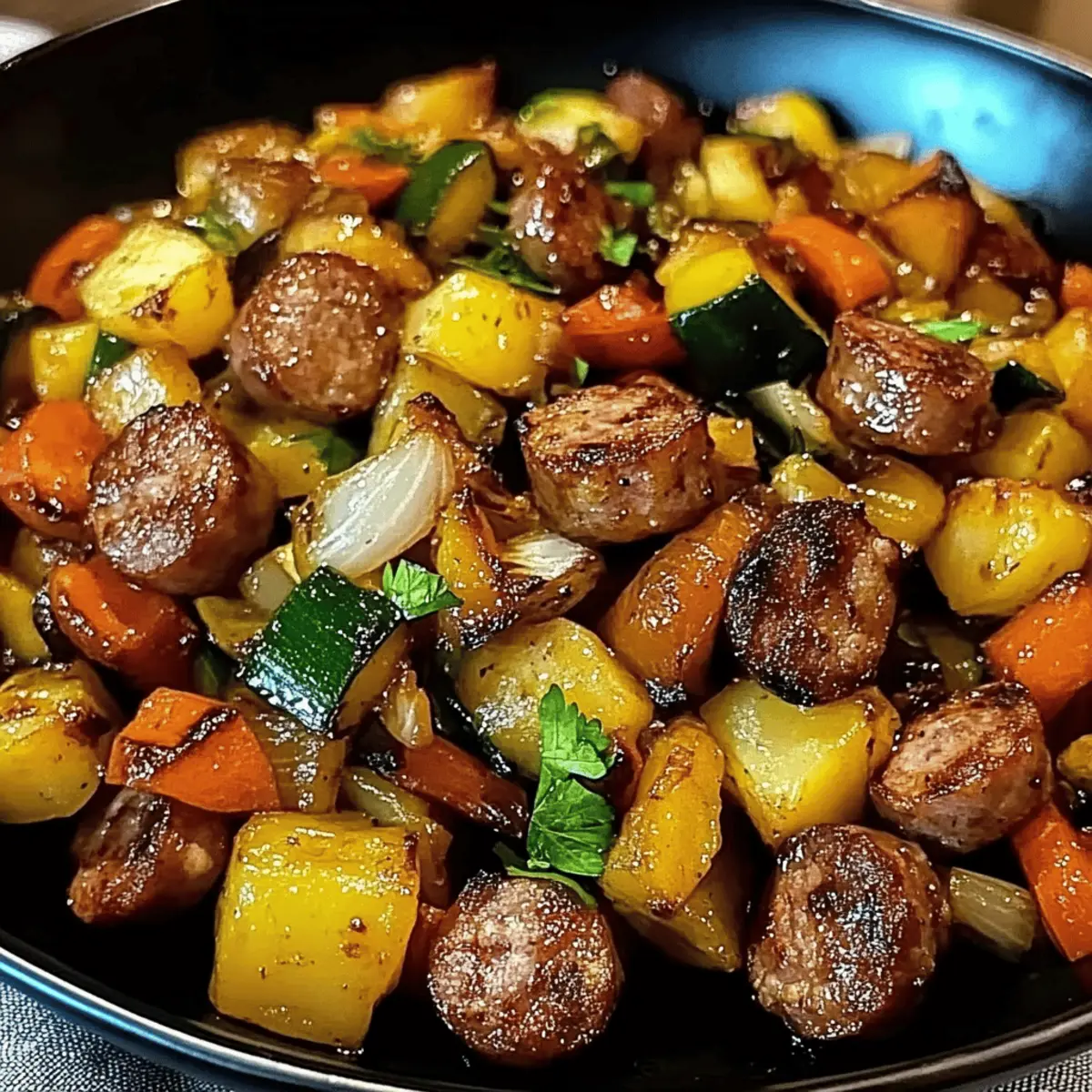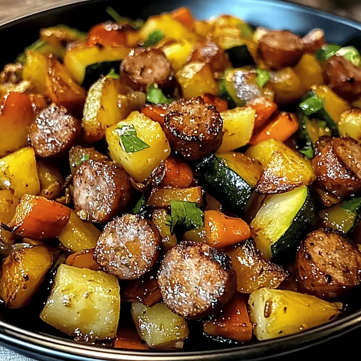 - Introduce the sliced smoked sausage to the sautéed veggies. Cook for an additional 4-5 minutes, stirring occasionally.