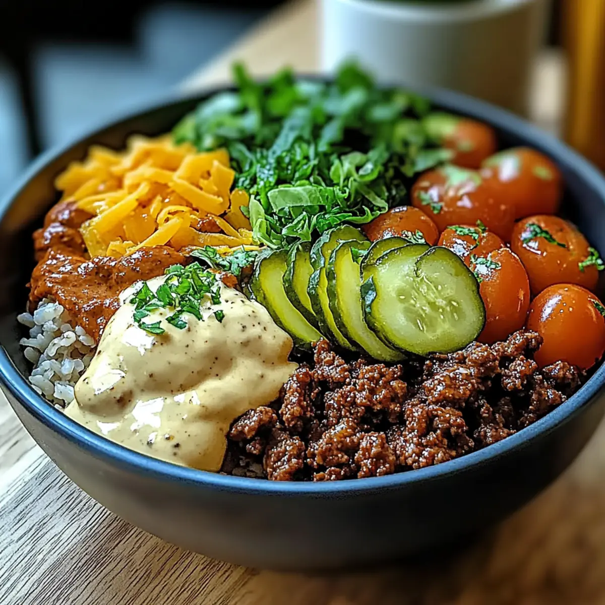 Once everything is ready, it’s time to assemble your Burger Bowls. Start with a generous serving of cooked brown rice at the bottom of each bowl. Next, add the browned beef over the rice, followed by layers of lettuce, tomatoes, and pickles. Sprinkle a handful of shredded cheddar cheese on top, creating a beautiful, colorful meal that’s sure to satisfy your cravings.