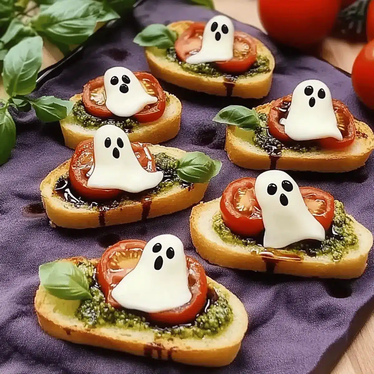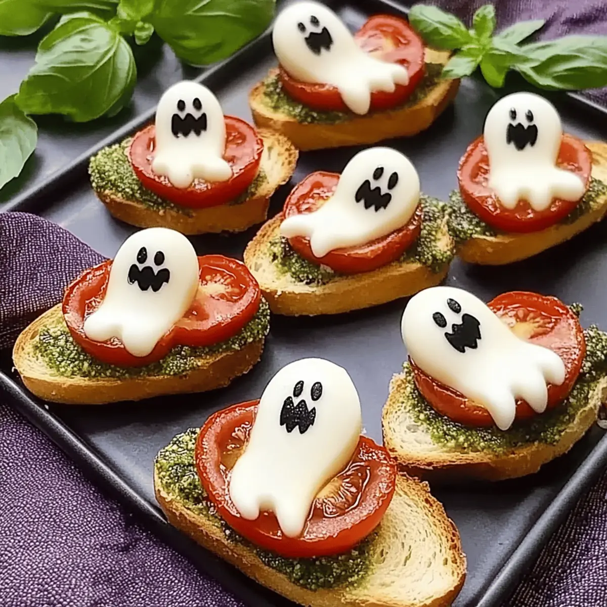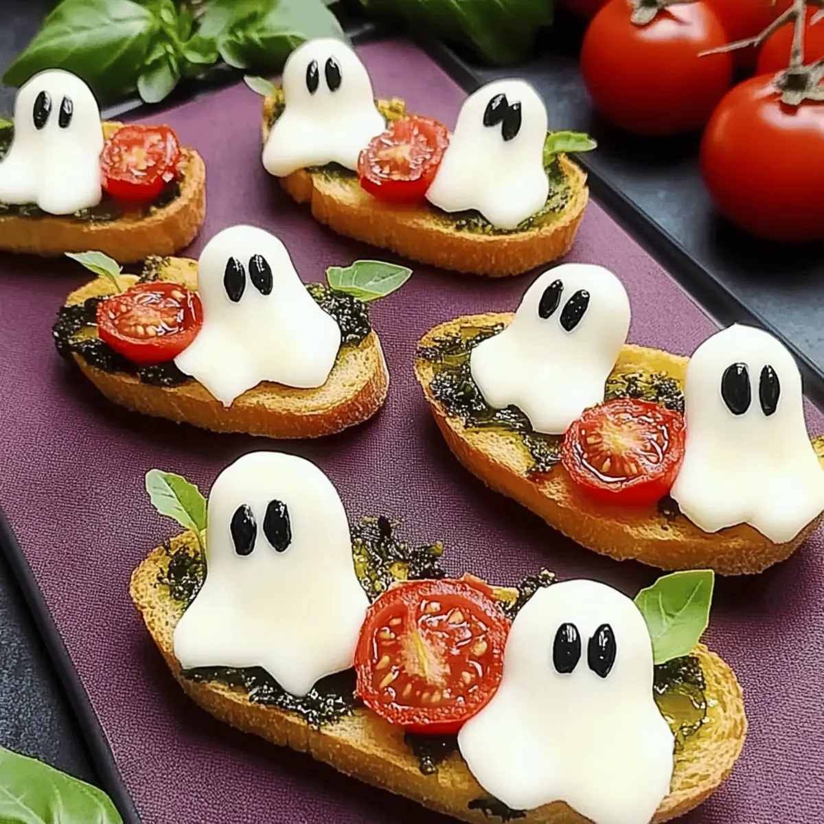 - Top half of the crostini with a slice of tomato and mozzarella, creating ghostly figures.