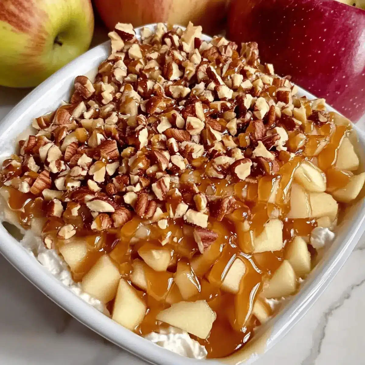 Sprinkle 1–2 fresh, diced apples and optional crushed pecans evenly over the caramel layer. The diced apples will add a refreshing crunch and a beautiful contrast in color, enhancing the overall appeal of your Caramel Apple Cheesecake Dip. If you prefer a nut-free option, simply skip the pecans.