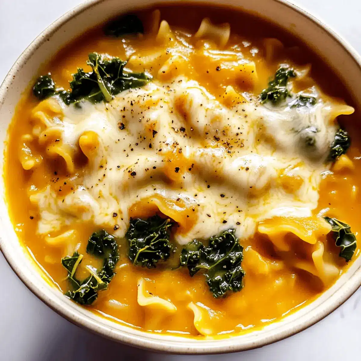 Cheesy Butternut Squash Lasagna Soup with Kale & Mozzarella