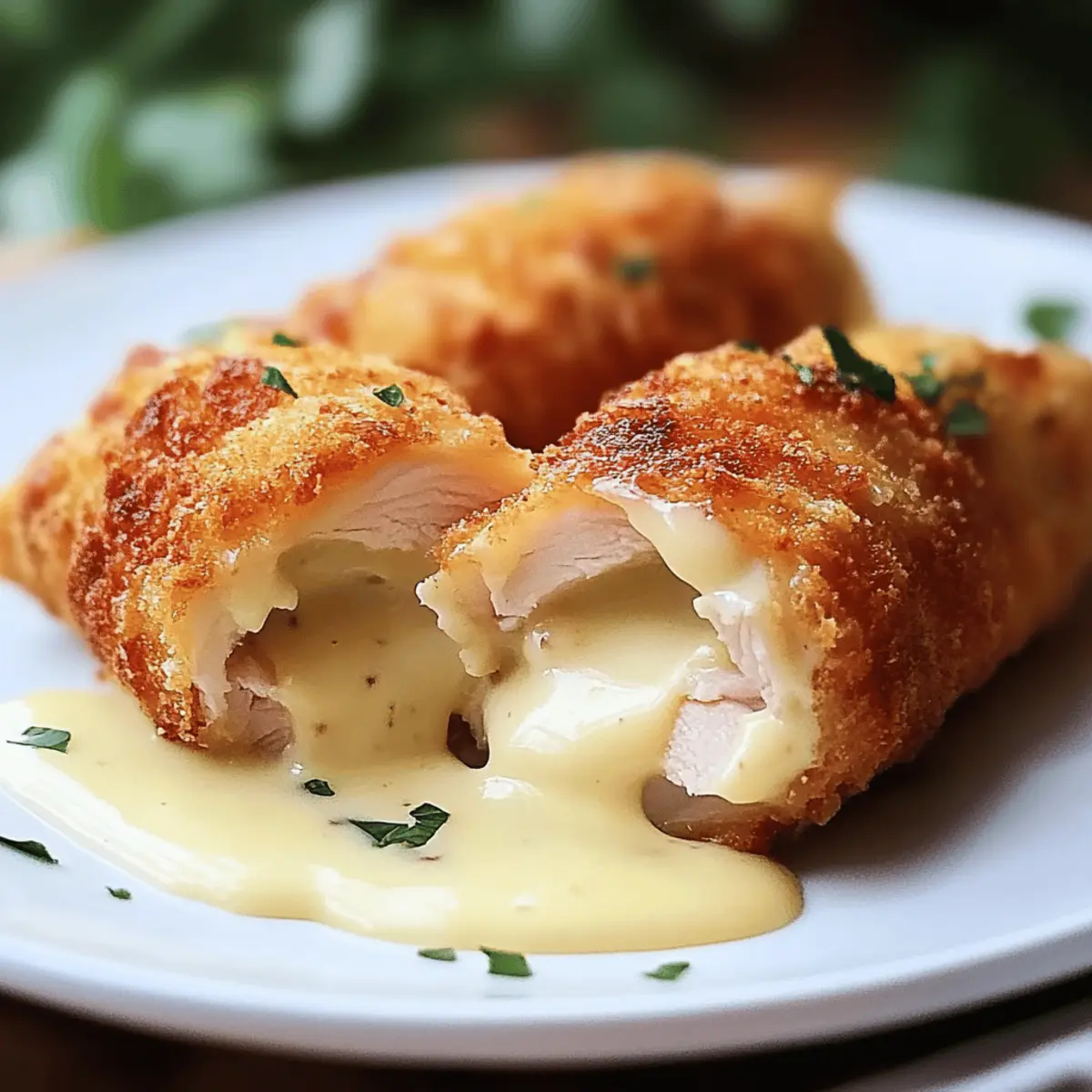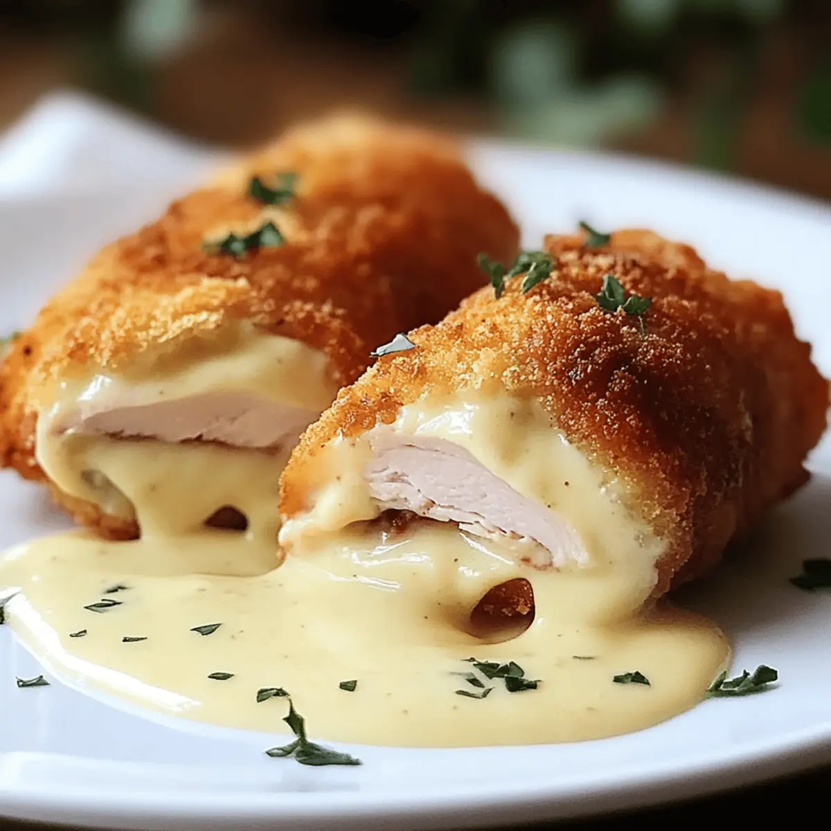 Once the Chicken Cordon Bleu is cooked, remove it from the oven and let it rest for about 5 minutes. This allows the juices to redistribute, keeping the chicken moist. Slice each roll and drizzle with the creamy Swiss cheese sauce before serving warm, showcasing your delightful culinary achievement!