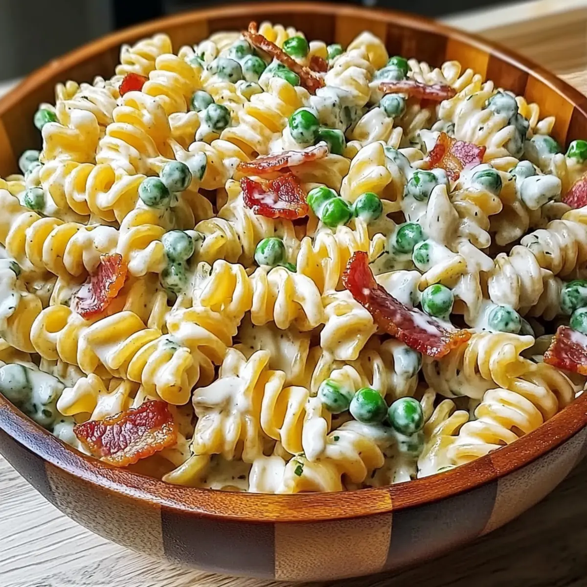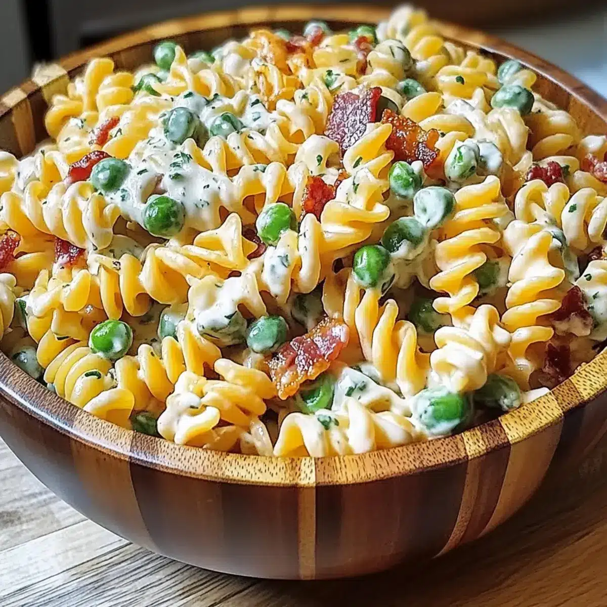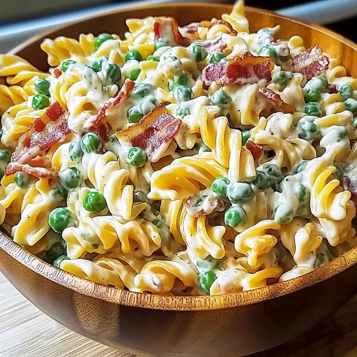 - In a large mixing bowl, combine the cooled rotini pasta, crispy chopped bacon, shredded cheddar cheese, sliced green onions, and thawed peas. Gently toss the ingredients together.