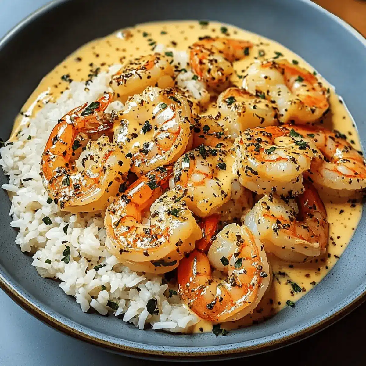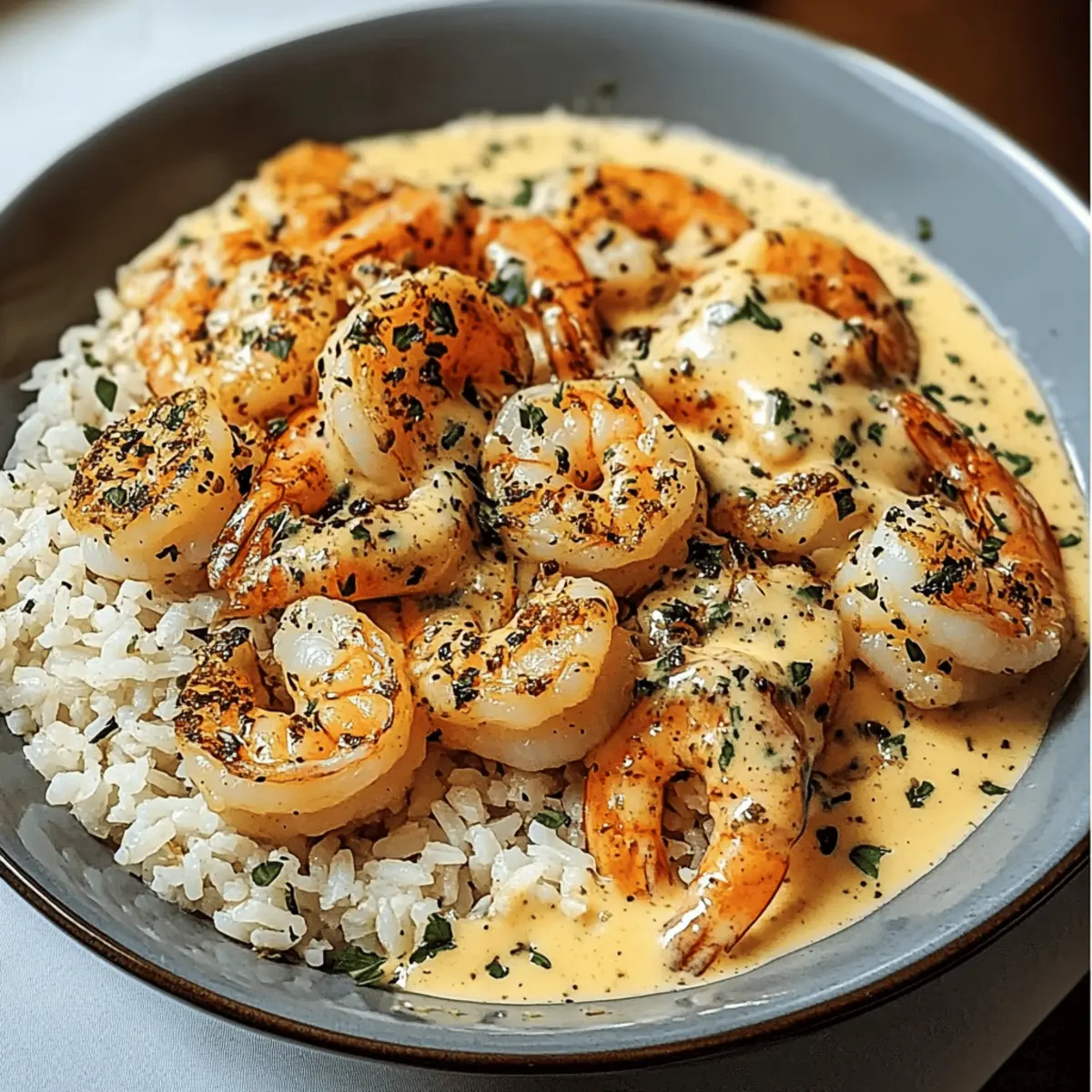 - Serve by scooping rice into bowls, topping with creamy shrimp mixture, and drizzling extra sauce on top.