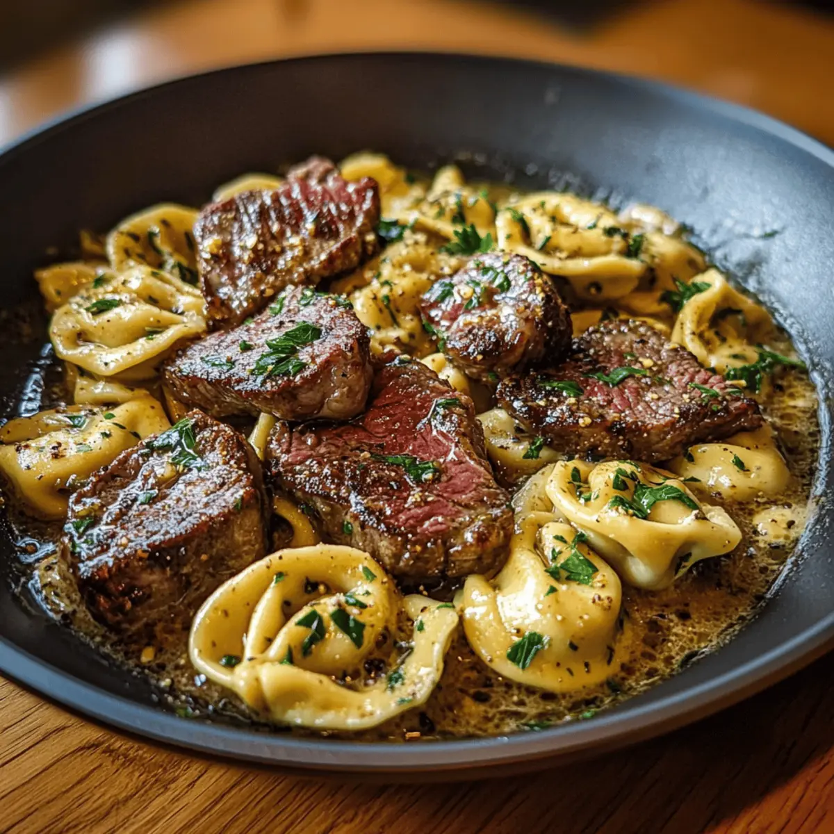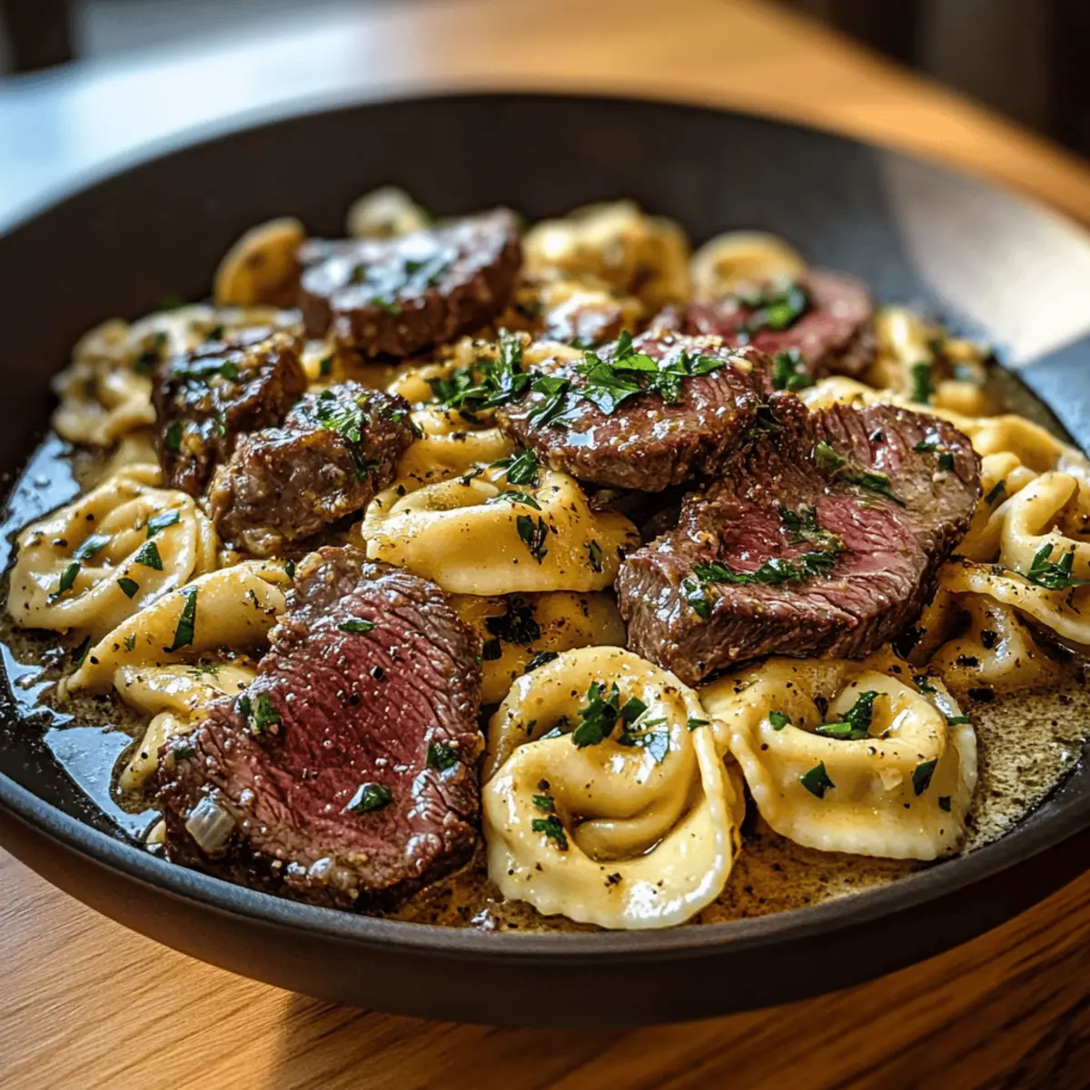 Once the tortellini is cooked to perfection, slice the resting steak thinly against the grain. Return the sliced steak to the skillet, mixing everything thoroughly to evenly distribute the flavors. Allow the mixture to heat through for an additional minute, letting the steak absorb the creamy sauce while melding the flavors beautifully.