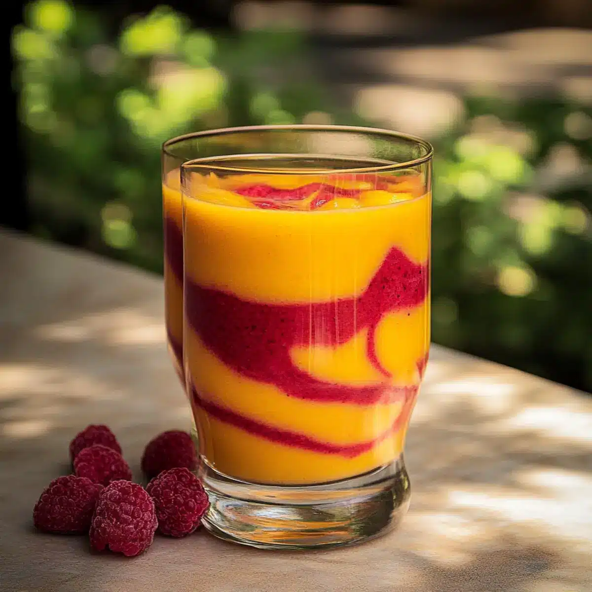 Begin by mashing 1 cup of fresh raspberries in a small bowl using a fork. Press until the berries release their juices, creating a vibrant purée. This process should take about 2-3 minutes. Once you’ve achieved a juicy consistency, set the raspberry purée aside to layer it later in your Golden Peach Sunrise Smoothie.