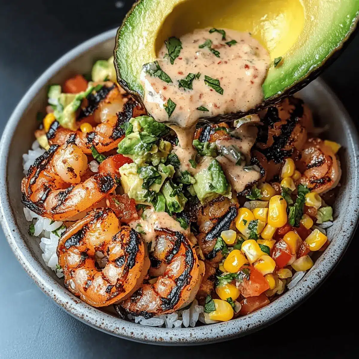 - Assemble the bowl by dividing cooked rice among bowls, layering with greens, topped with grilled shrimp, avocado slices, and corn salsa.