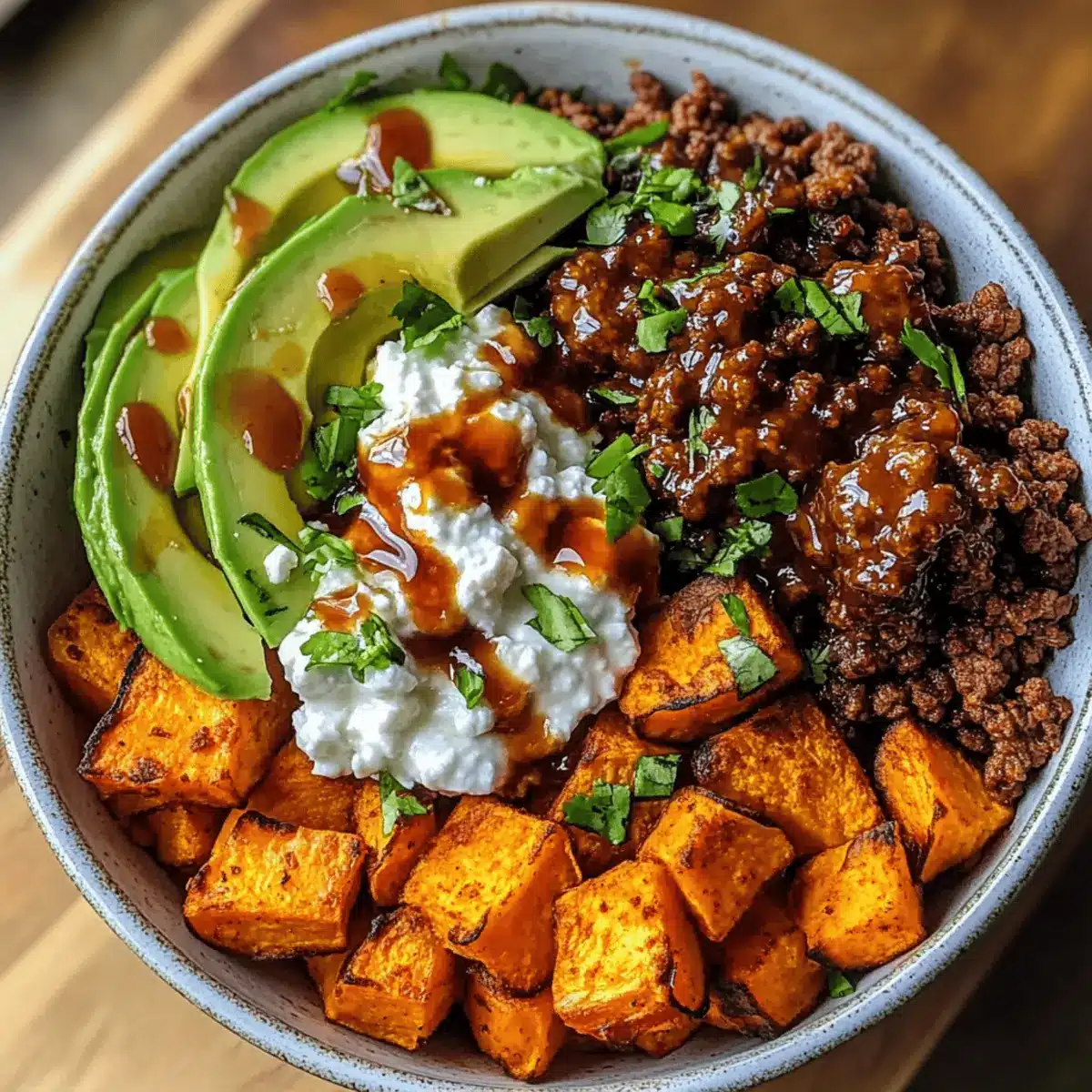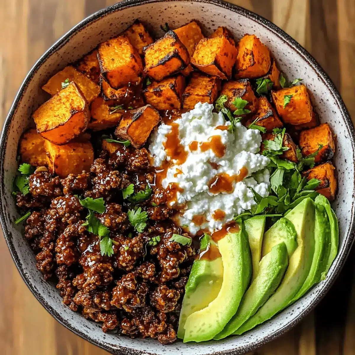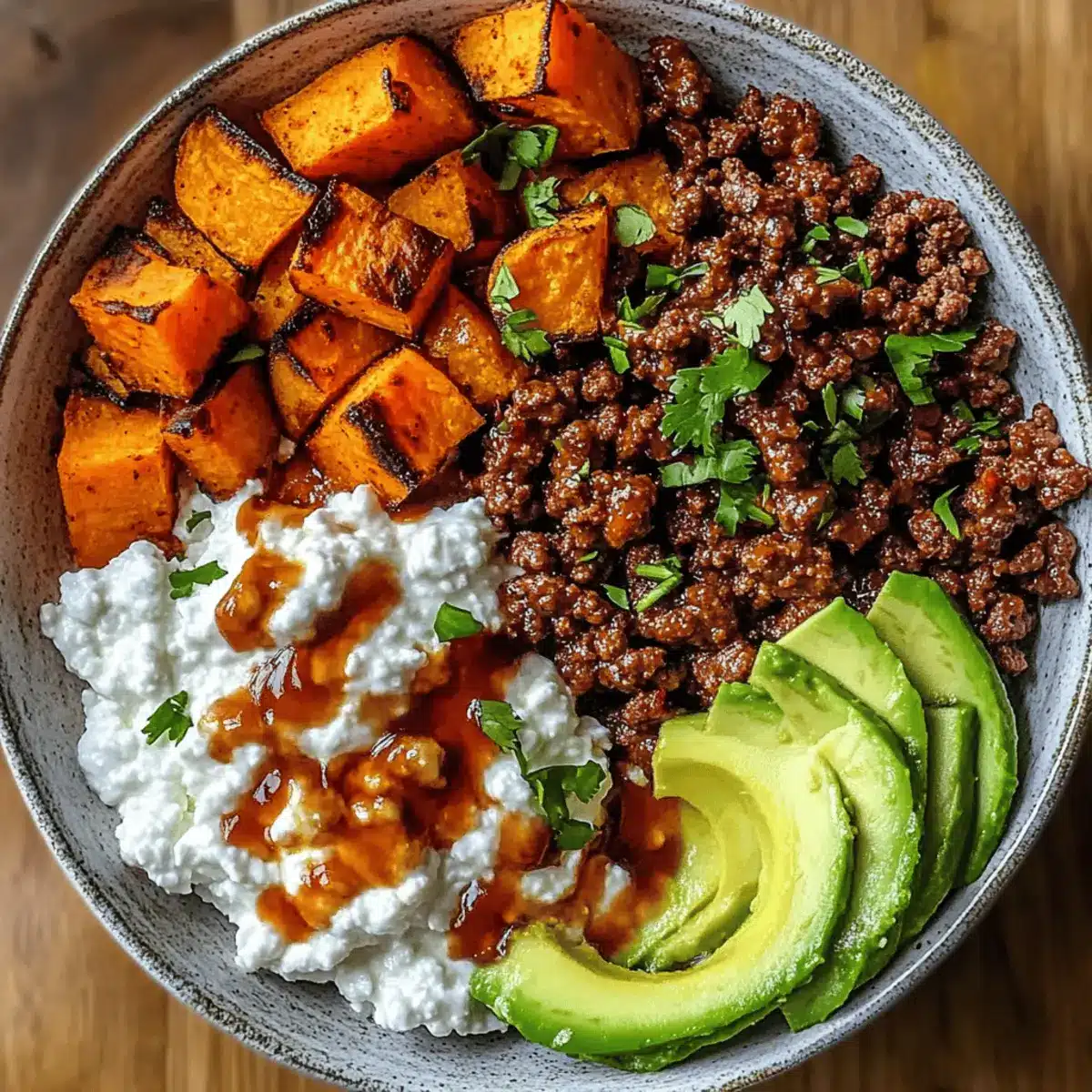 - Assemble your bowl starting with roasted sweet potatoes, then top with seasoned ground beef and cottage cheese.