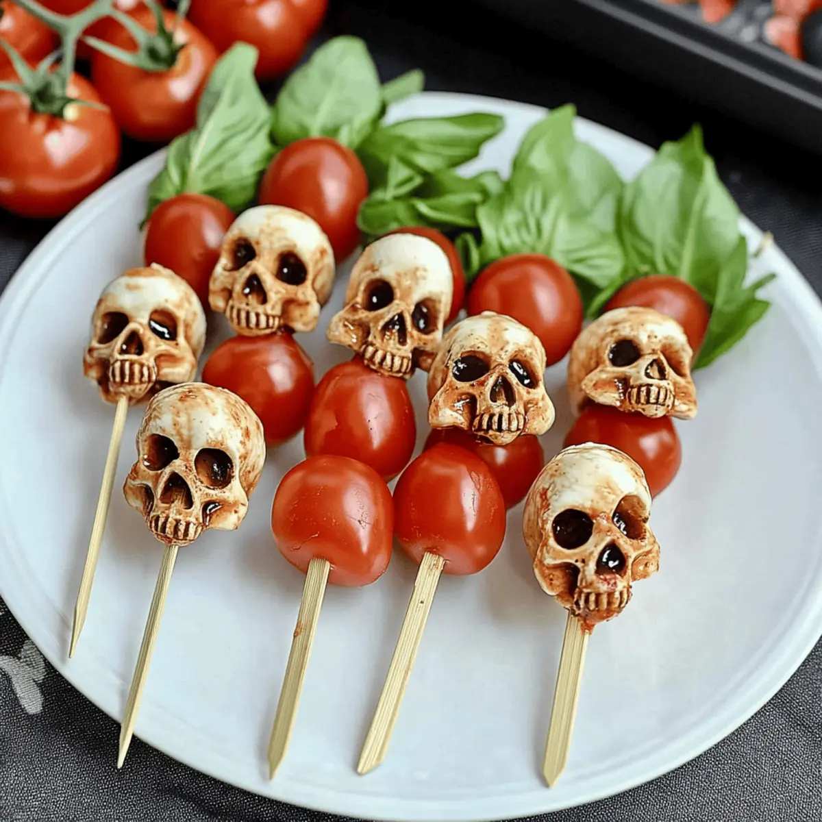 - Assemble your skewers by threading one skull, a basil leaf, and a cherry tomato onto bamboo picks.