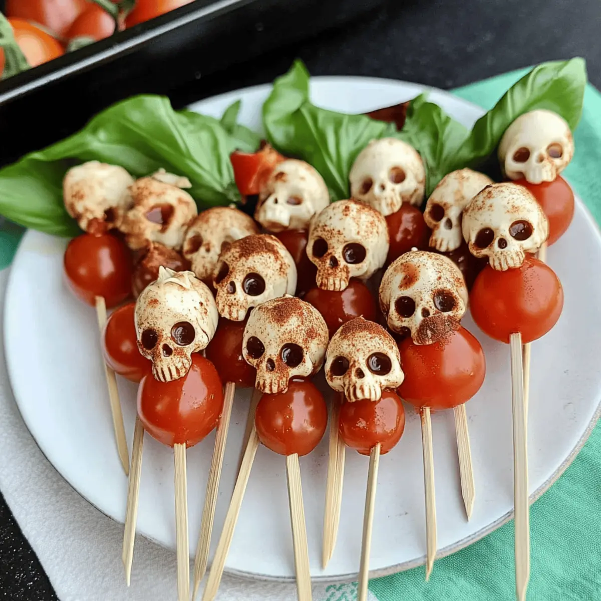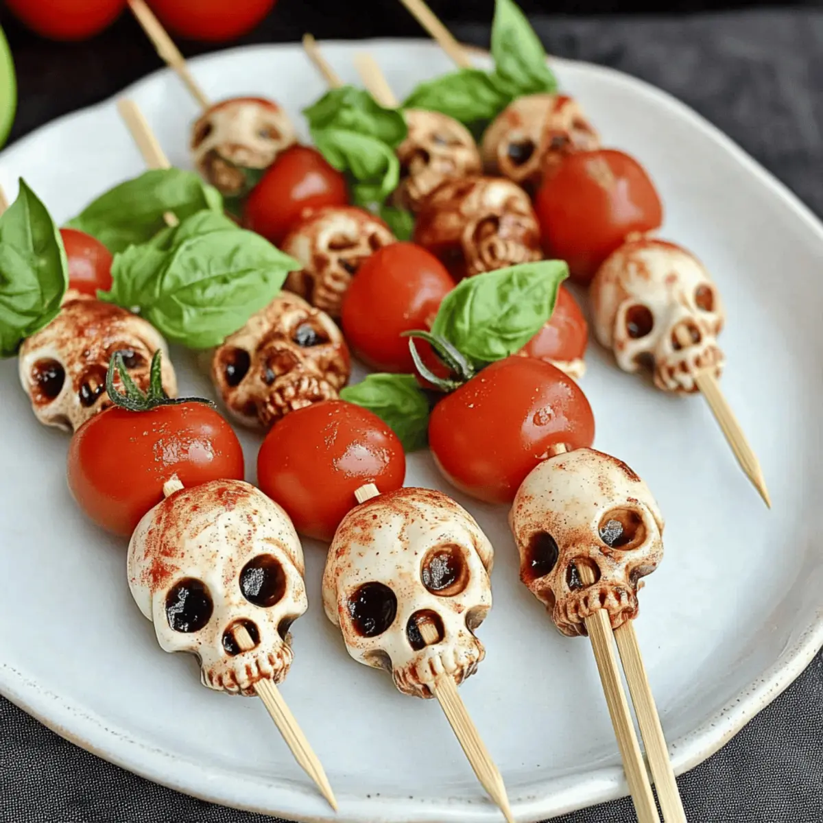 Once your mozzarella skulls are ready, it’s time to assemble your Halloween Caprese Salad Skewers! Take bamboo picks and thread one skull, followed by a basil leaf and then a cherry tomato. Alternate these ingredients until you have a festive skewer. The vibrant colors and skull shapes will bring festive cheer to your gathering!