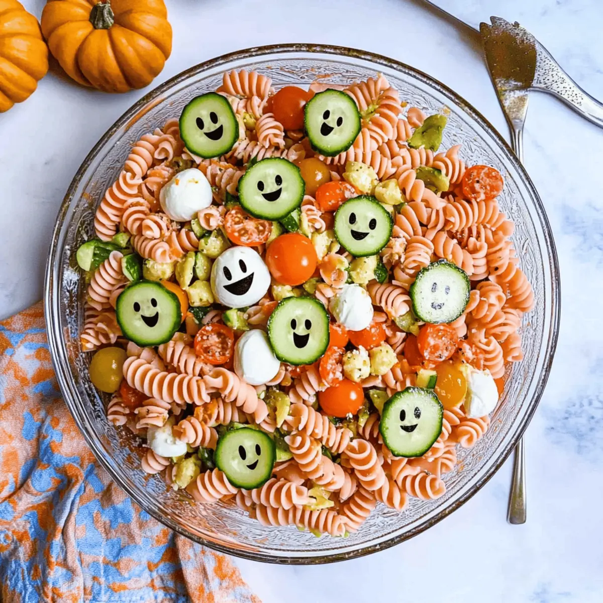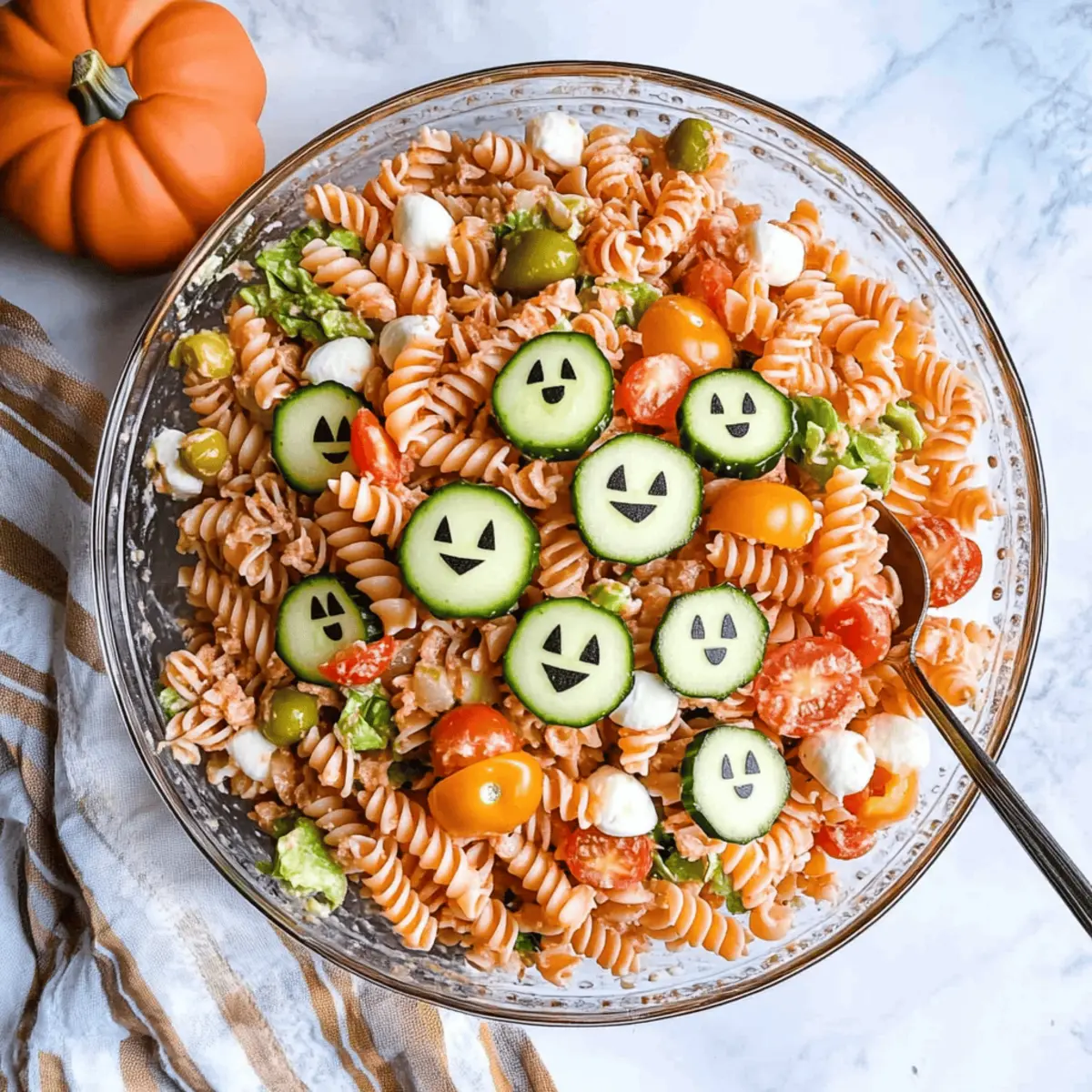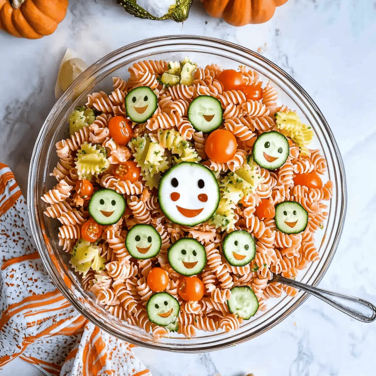 Before serving, garnish your pasta salad with the carved cucumber faces for that fun Halloween flair. For the best flavor experience, chill the salad in the refrigerator for about 30 minutes to allow the ingredients to meld together beautifully. Serve it at your festive gathering and watch your guests enjoy the spooky charm of this delicious and colorful dish!