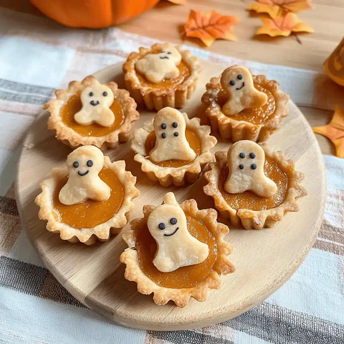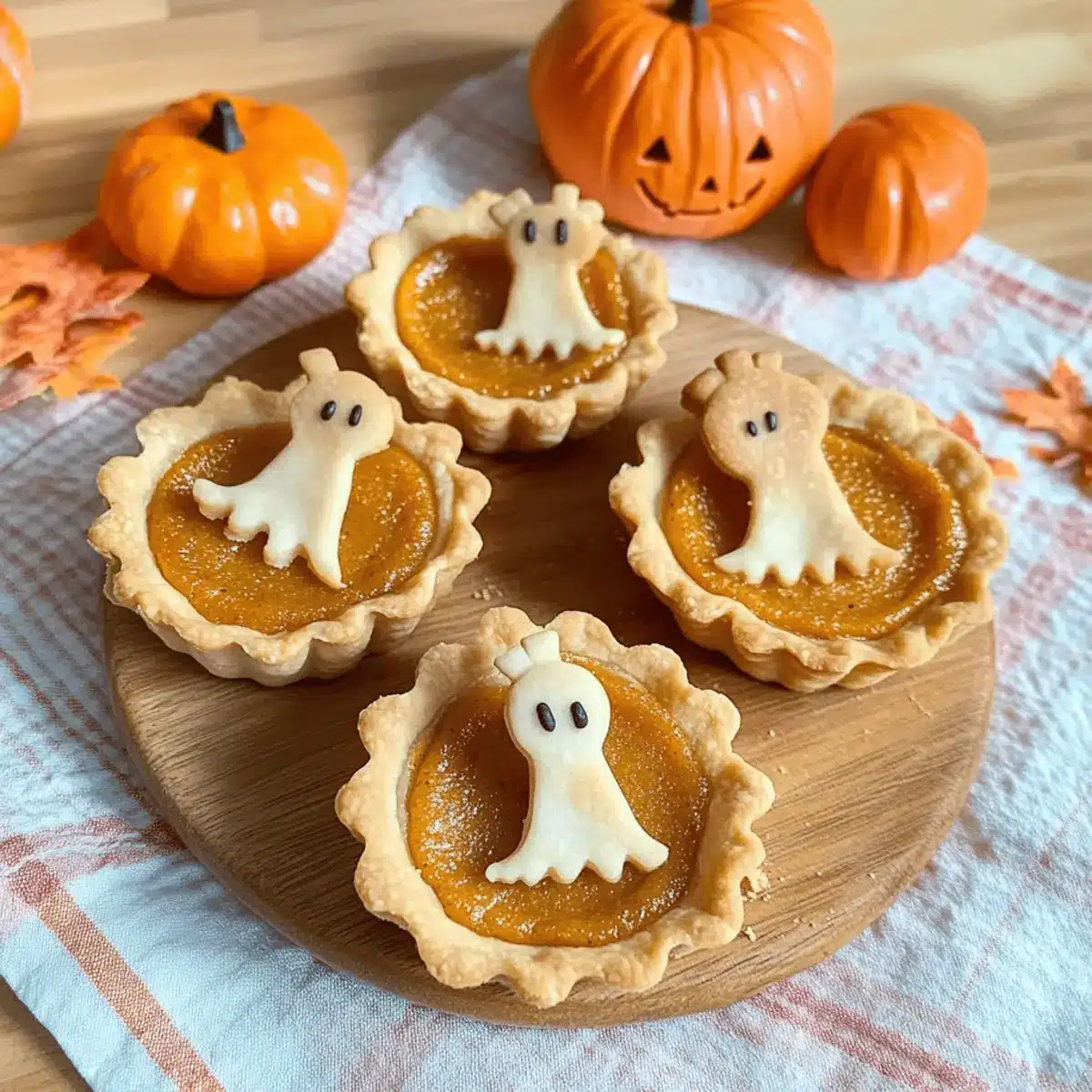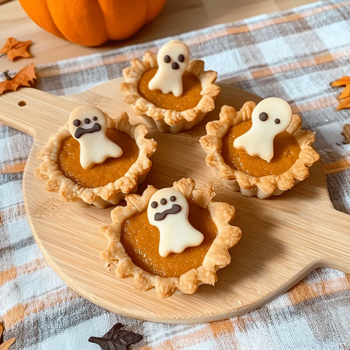 - Once the tarts have cooled for a few minutes, carefully place the spooky ghost decorations on top of each pumpkin tart. These completed Halloween Pumpkin Tarts are now ready to be the star of your gathering.
