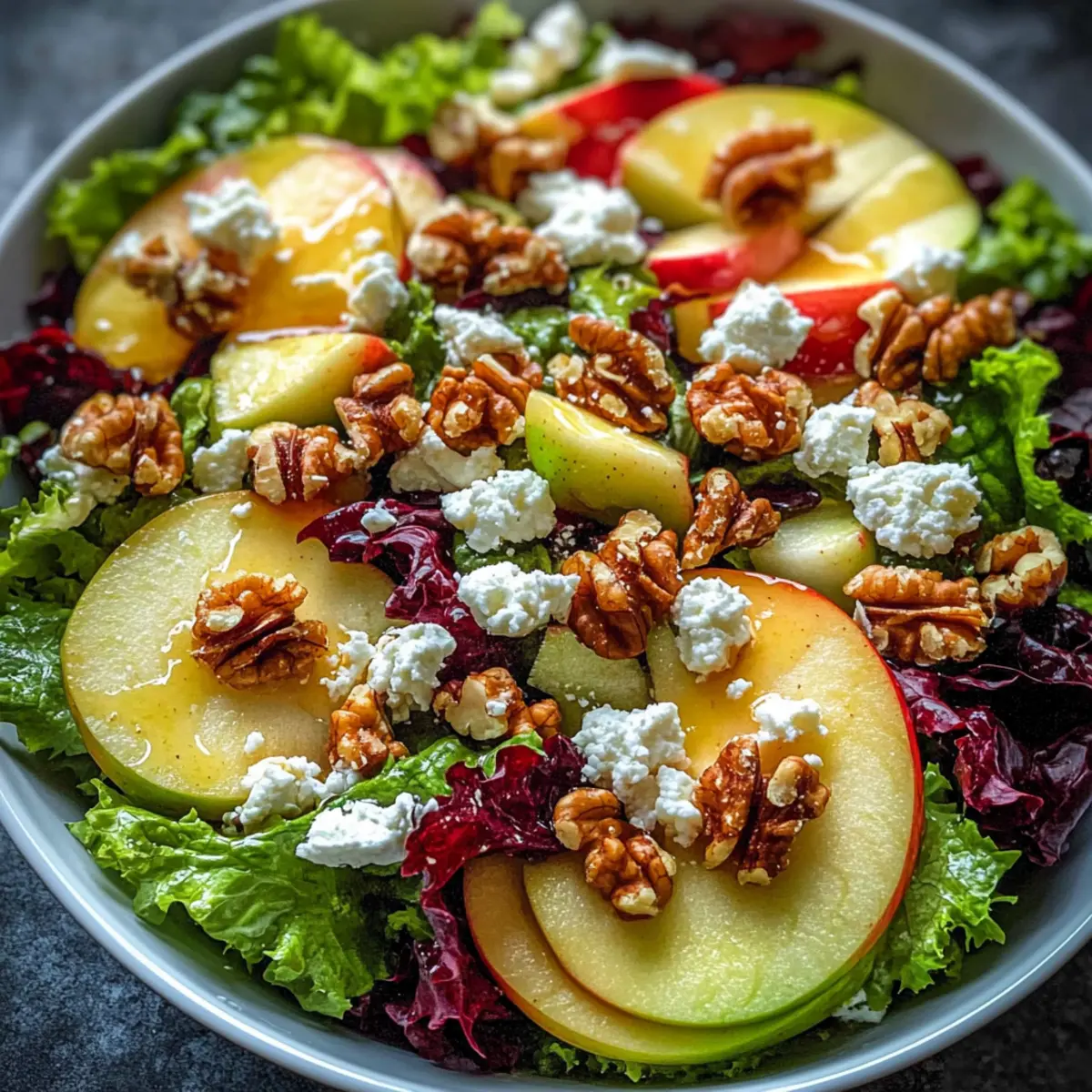- In a large salad bowl, gather mixed greens. Add sliced apples, feta, walnuts, and cranberries, ensuring even distribution.