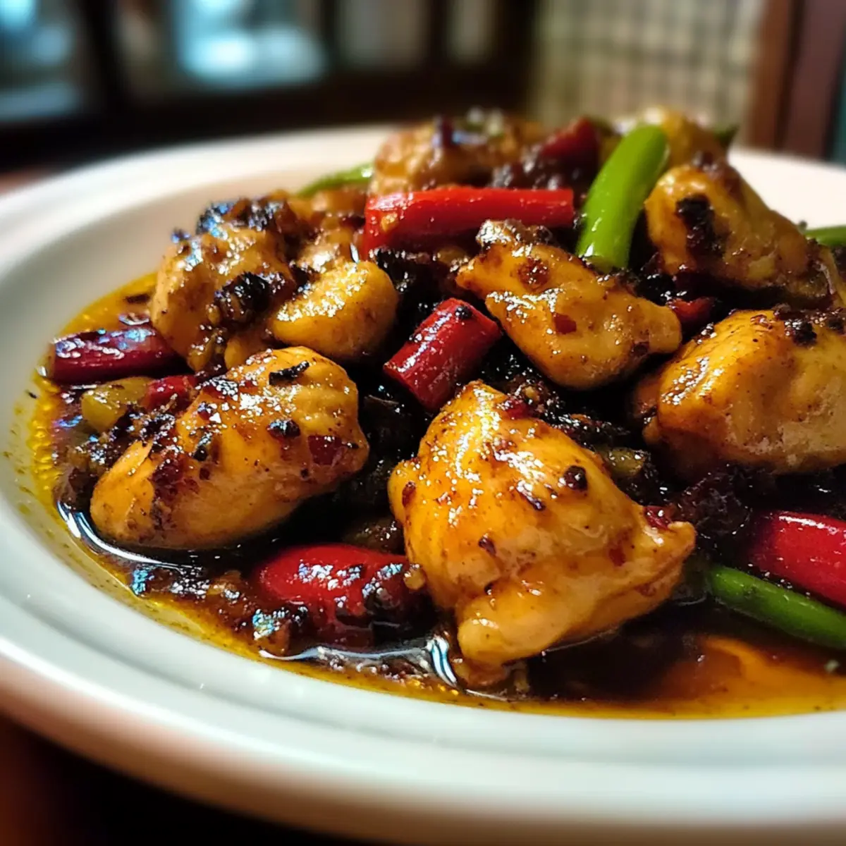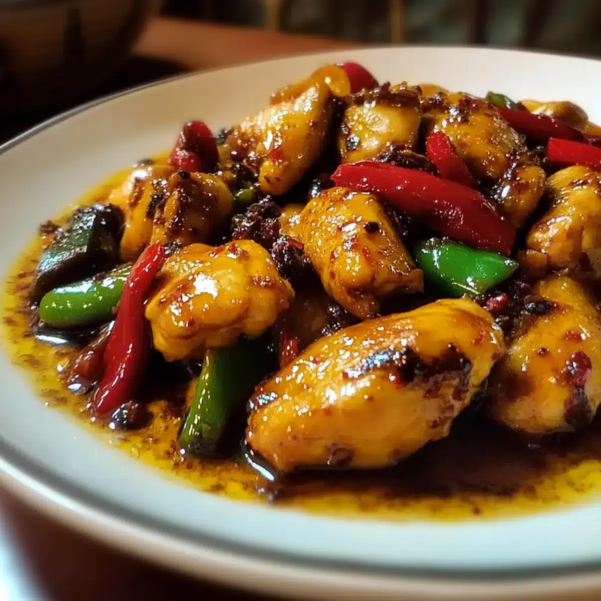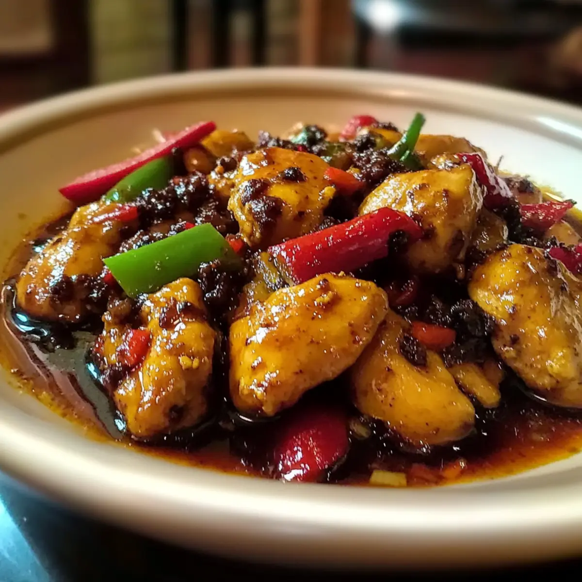 Return the seared chicken along with any resting juices back into the wok. Immediately pour the prepared sauce over the mixture, tossing everything together. Stir well to ensure the chicken and vegetables are evenly coated in the rich, spicy sauce.