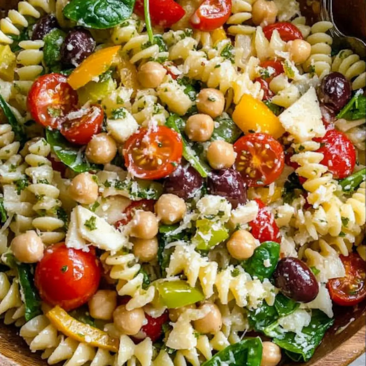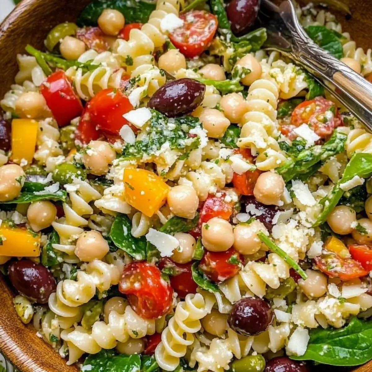 In a large mixing bowl, combine the cooked fusilli pasta with the chickpeas, halved cherry tomatoes, sliced mini sweet peppers, and roughly chopped baby spinach. Gently mix in the sliced pepperoncini and halved Kalamata olives, followed by the grated Parmesan and cubed provolone cheese. This colorful medley is the heart of your Italian Pasta Salad, bursting with freshness and texture.