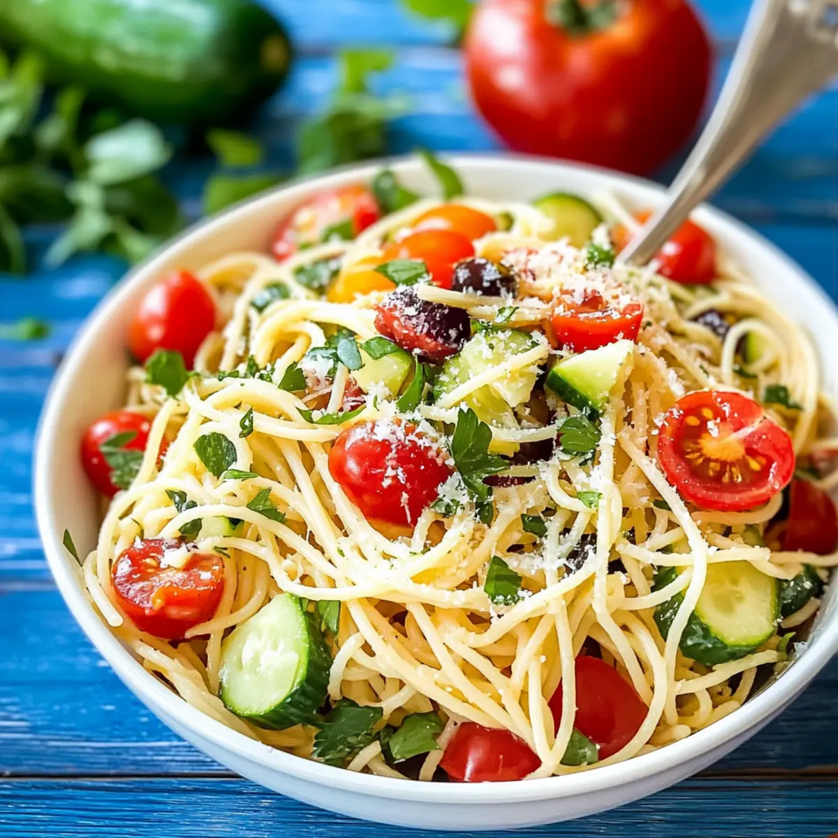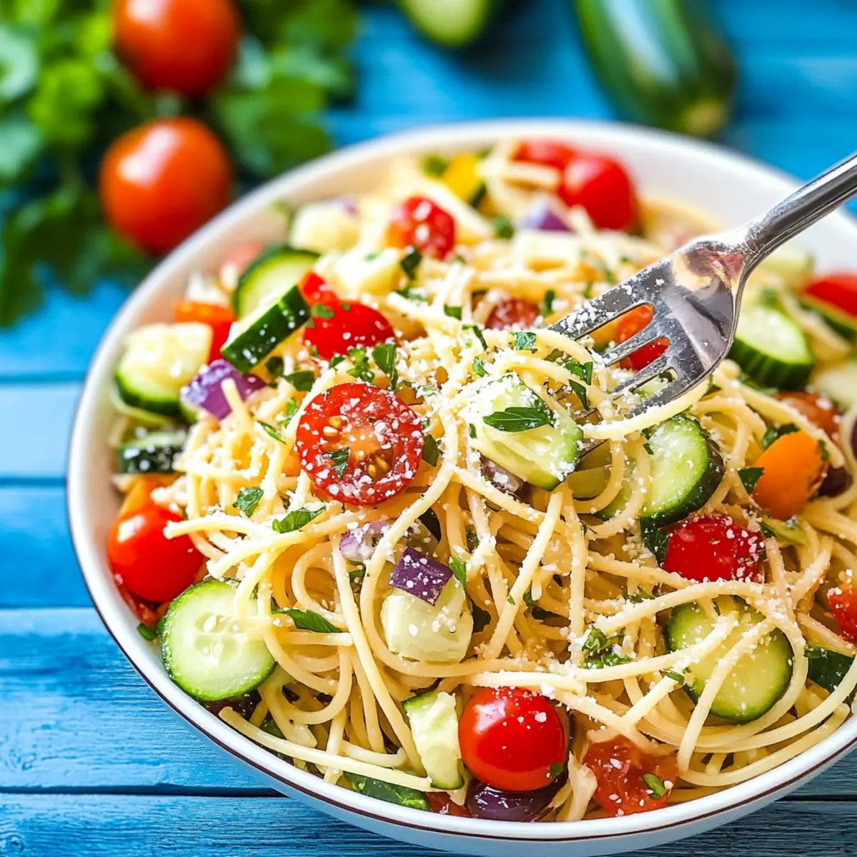 Preparing your Italian Spaghetti Salad ahead of time is a fantastic way to save valuable minutes during busy summer days! You can make the salad up to 24 hours in advance; just follow these simple steps. First, cook the spaghetti and rinse it under cold water, as you usually would, then chop the tomatoes, zucchini, cucumber, and bell peppers. Combine all the components in a bowl, but hold off on adding the dressing until you’re ready to serve. This will help maintain the crispness of the vegetables and prevent sogginess. Cover the salad tightly and refrigerate it. Just before serving, gently toss in the Italian dressing and enjoy a fresh, vibrant salad that tastes just as delicious as when it was first made!