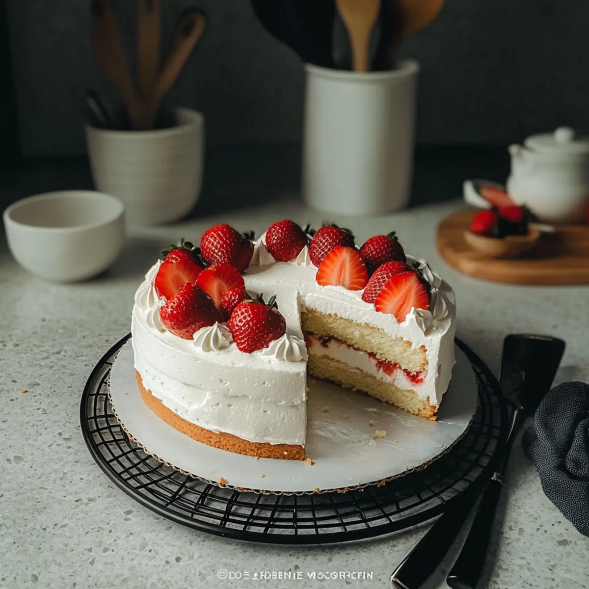 After the cake has cooled completely, slice it into two equal layers. Brush each layer lightly with the cake syrup to keep them moist, then spread a layer of the whipped cream on top. Layer with the macerated strawberries, ensuring each bite has a burst of flavor.