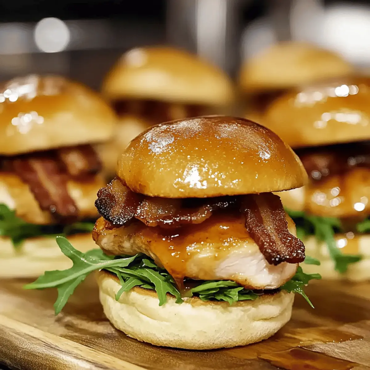 - Toast slider buns, layer with arugula, sliced chicken, and bacon.