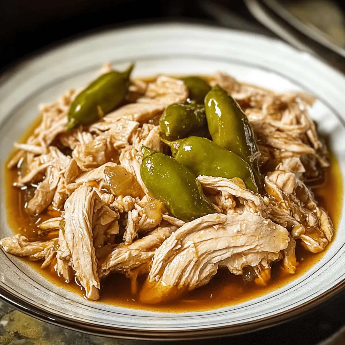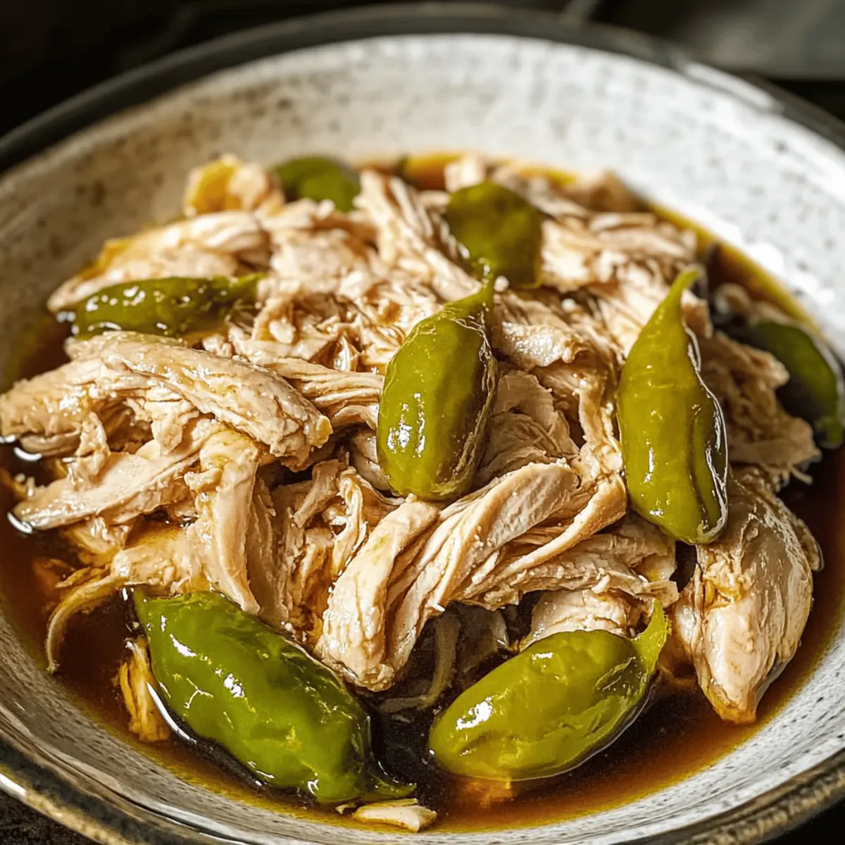 - Pour the zesty pepperoncini juice over the chicken, ensuring even coating. Scatter whole pepperoncini peppers on top.