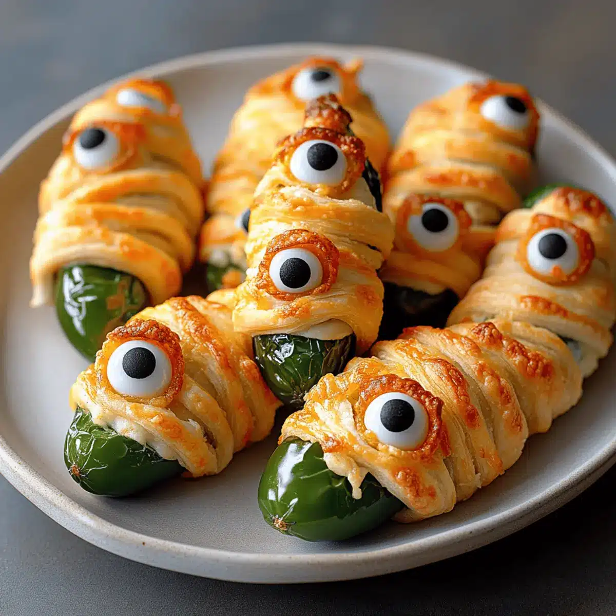 After removing the Mummy Jalapeño Poppers from the oven, let them cool slightly before adding the finishing touches. Gently press candy eyeballs into the openings of the dough, giving your poppers a fun, festive personality. Serve them warm and watch your guests delight in this spooky treat!