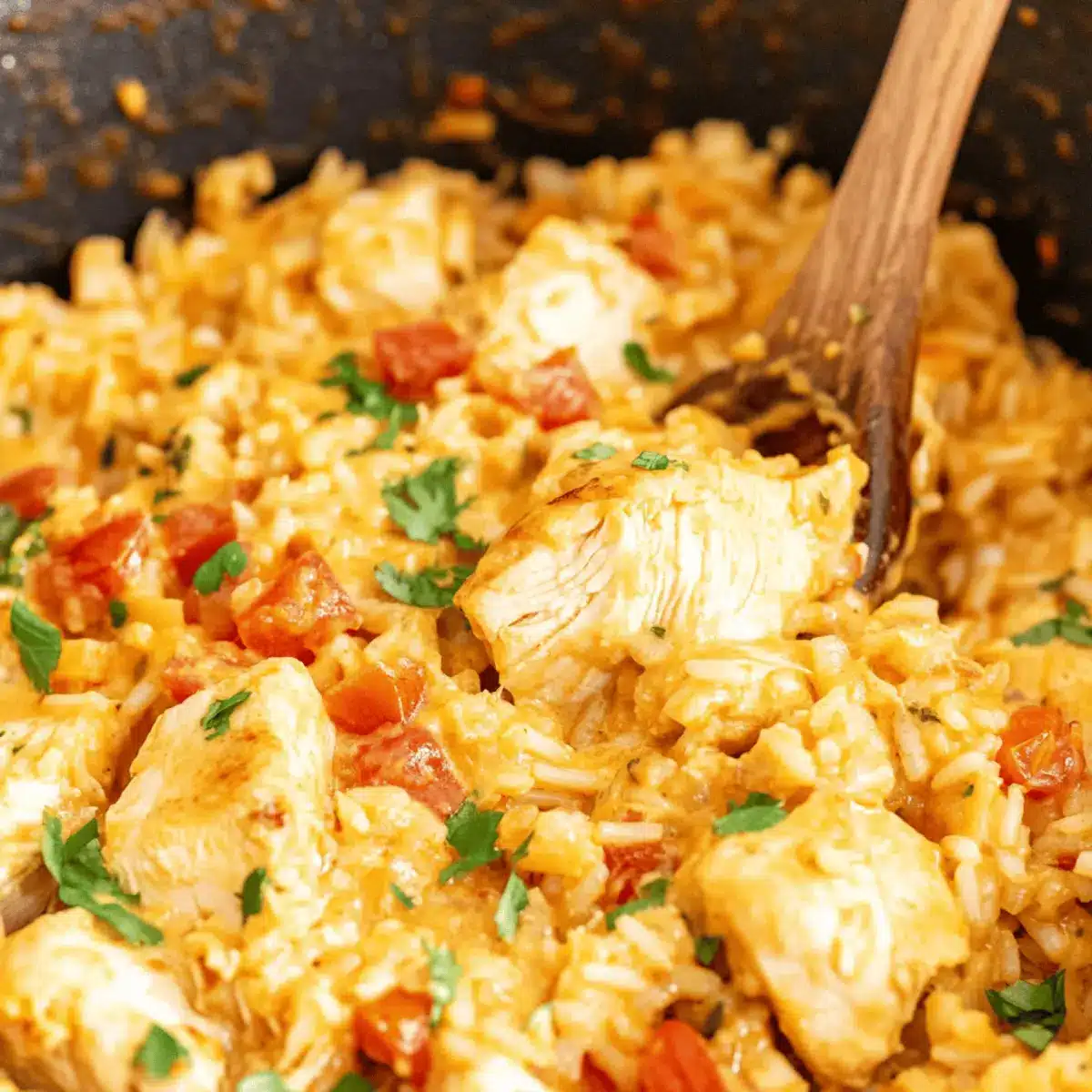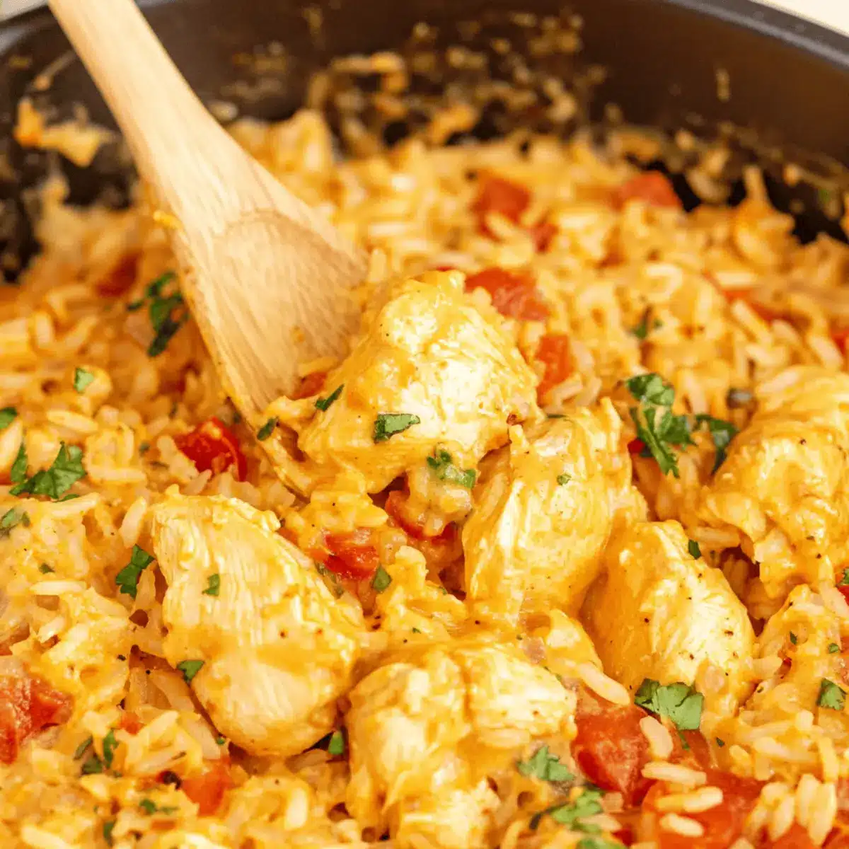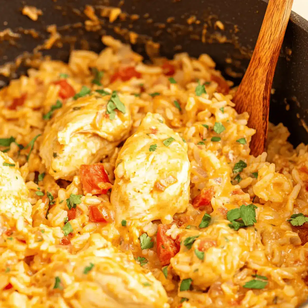 - Once the rice has absorbed the liquid and has a tender texture, remove the skillet from heat. Fluff the rice gently with a fork to mix everything together, incorporating the creamy sauce and tender chicken.