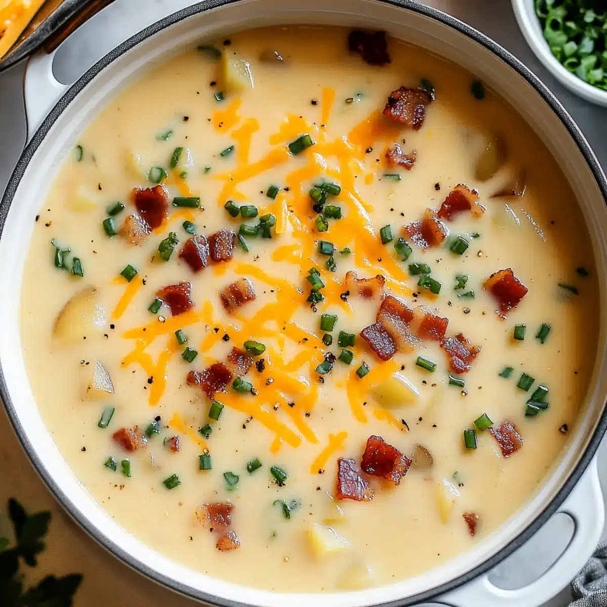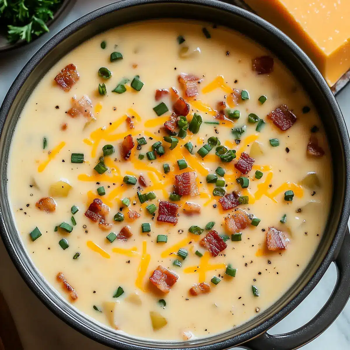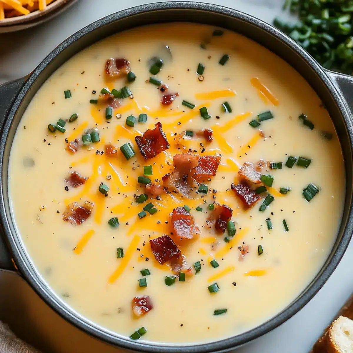 - Ladle portions into bowls, topping with crumbled bacon, cheddar cheese, and diced green onions.