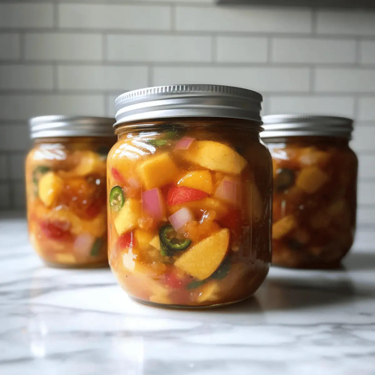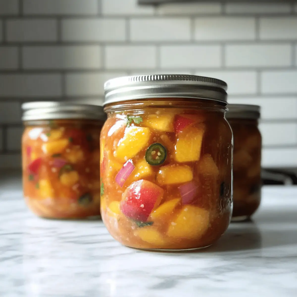 - Ladle the hot peach salsa into pre-sterilized jars, leaving ½ inch of headspace. Remove air bubbles with a non-metallic utensil, wipe the rims, and secure the lids.