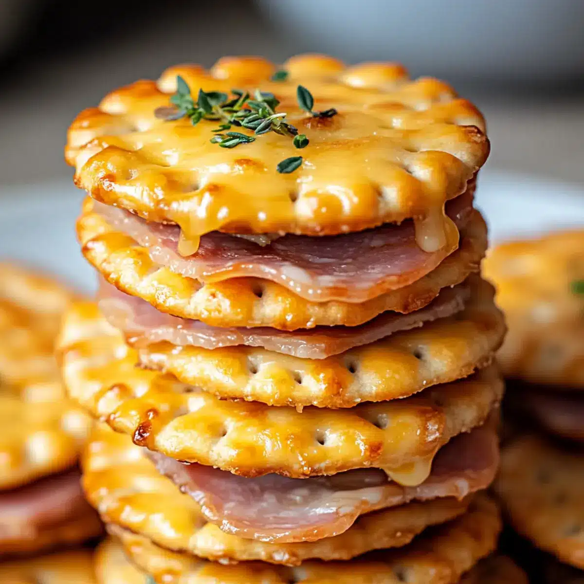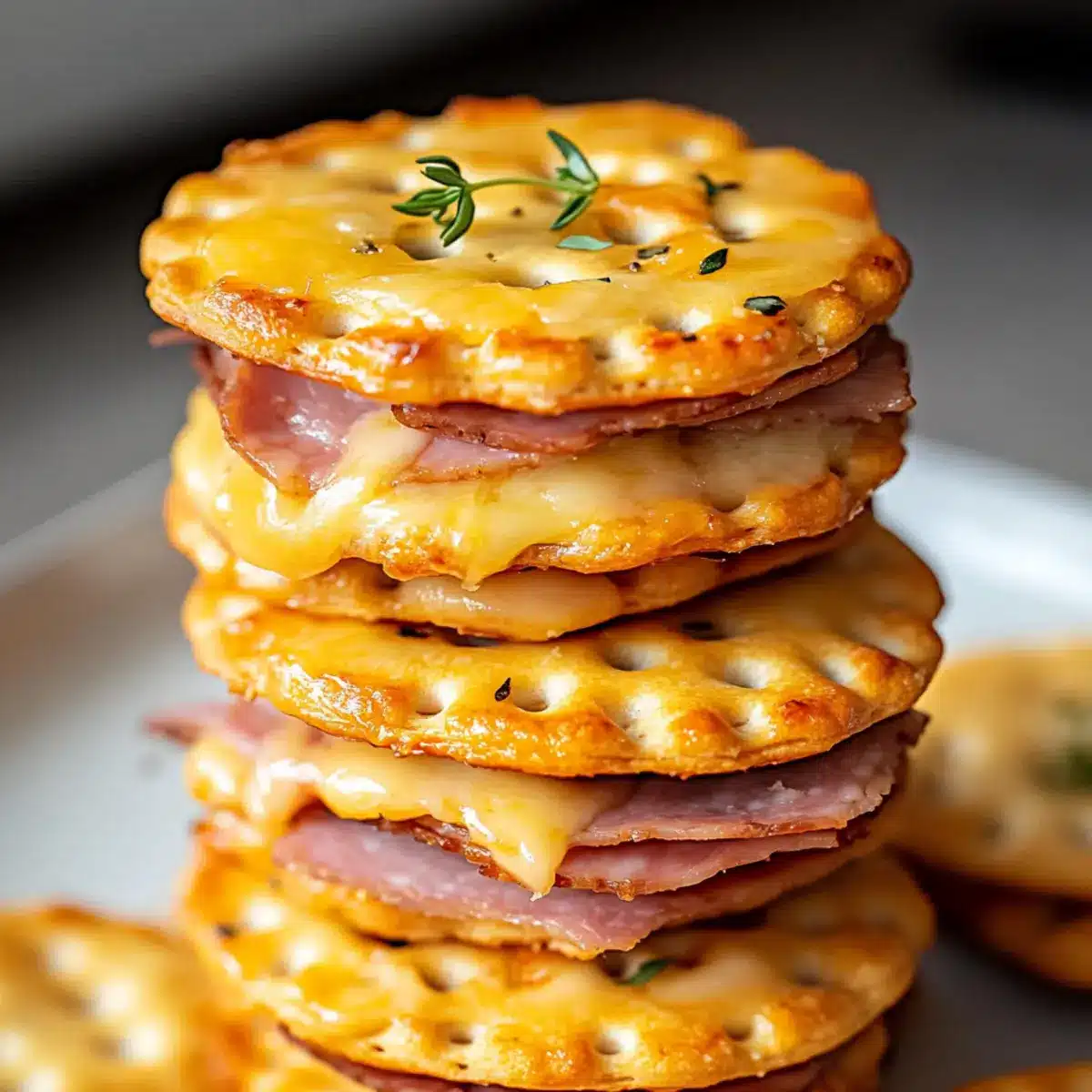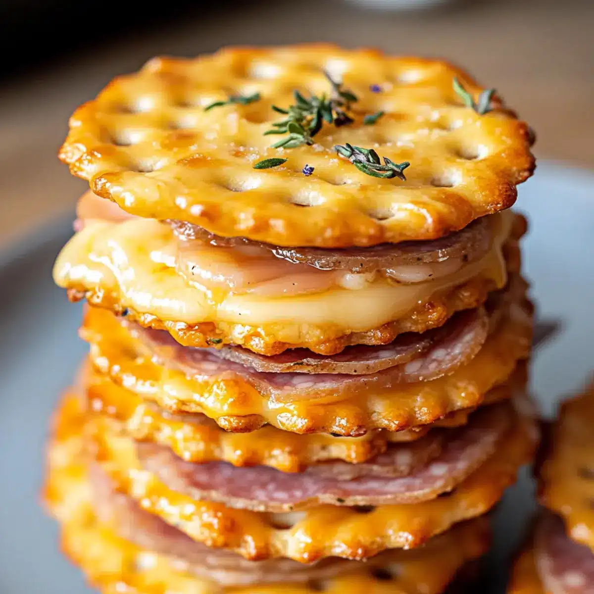 Using a pastry brush, generously apply the butter mixture on top of each assembled sandwich. Slide the baking sheet into the preheated oven and bake for about 8 to 10 minutes. Watch closely for the crackers to turn golden and the cheese to melt invitingly, signaling they’re ready to be devoured.