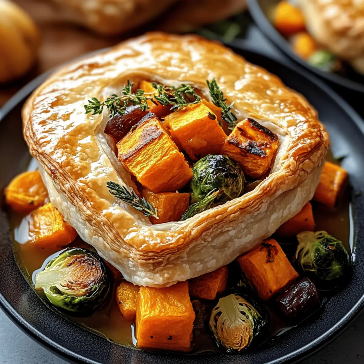 In a large mixing bowl, toss cubed butternut squash, sliced carrots, parsnips, sweet potatoes, and halved Brussels sprouts with olive oil. Season the mixture generously with salt, pepper, fresh thyme, and rosemary. The vegetables should glisten with oil and spices, ensuring they roast evenly to achieve a tender, caramelized texture in the Roasted Autumn Vegetable Pot Pies.
