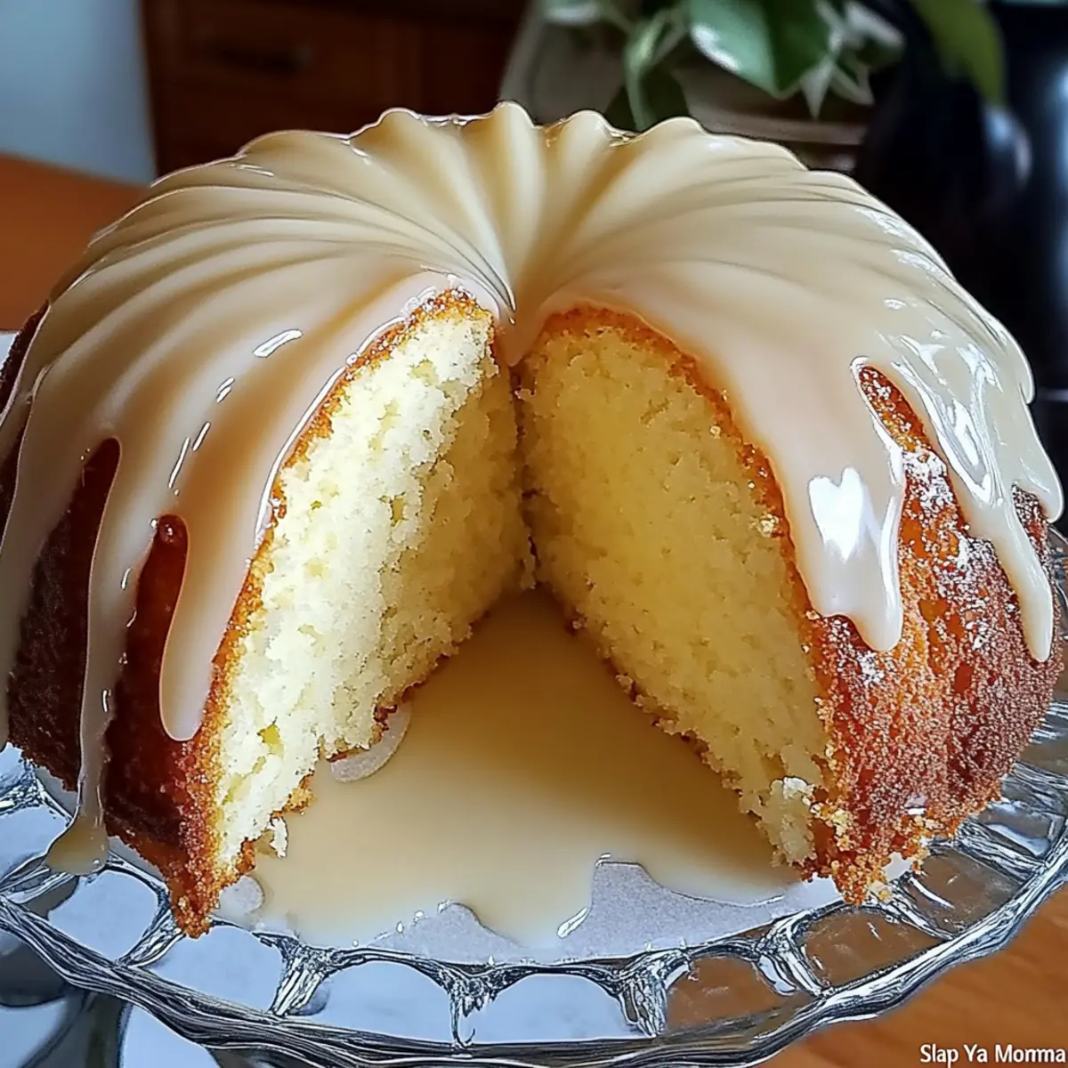 Once the cake is completely cooled, generously drizzle the prepared glaze over the top, allowing it to cascade down the sides. The glaze adds a sweet finish and enhances the overall appeal of your “Slap Ya Momma” Pound Cake. Let it sit for a few moments to set before slicing into this beautifully moist treat.